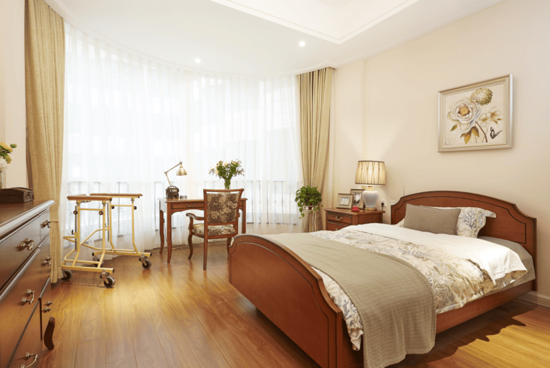 五星级宾馆式养护区:半非自理和认知照护、舒缓疗护长者入住,设置52平方米VIP套间、52平方米豪华双人间、31平方米普通双人间,有氧气装置。每层设有护士站,医护人员24小时值班,配备天轨移位系统,为半自理非自理长者站立、行走、康复、洗浴、如厕、室外活动和生活照料等提供保障。