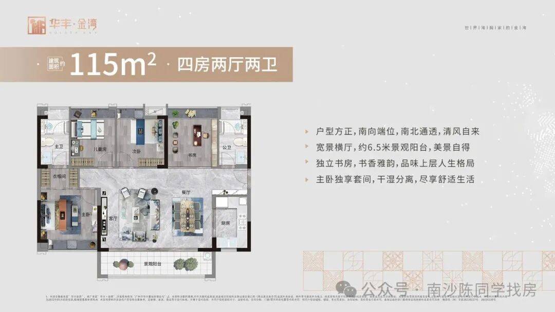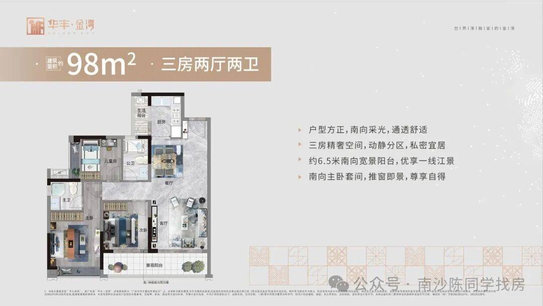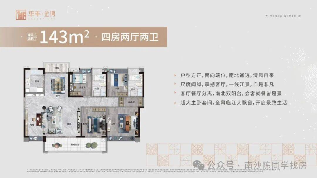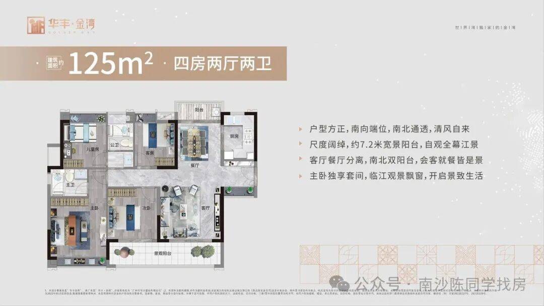 教育与环境的焦虑。孩子需要一个优质的成长环境,老人需要一个安静的养老空间;三是品质的落差。很多新盘虽然位置好,但户型设计不合理、梯户比拥挤、园林简陋,入住后才发现“住得不舒服”。针对这些痛点,华丰金湾在产品设计之初就进行了全方位的思考与打磨。我们摒弃了传统的高密度排布,采用了全南向排江景的布局,确保每一户都能享有充足的采光和开阔的视野。我们引入了 2 梯 3 户、2 梯 4 户的超低梯户比配置,大幅减少了等待电梯的时间,提升了居住的私密性和尊贵感。我们精心打造了全龄化社区园林,让儿童有乐园,青年有跑道,长者有休憩之所。